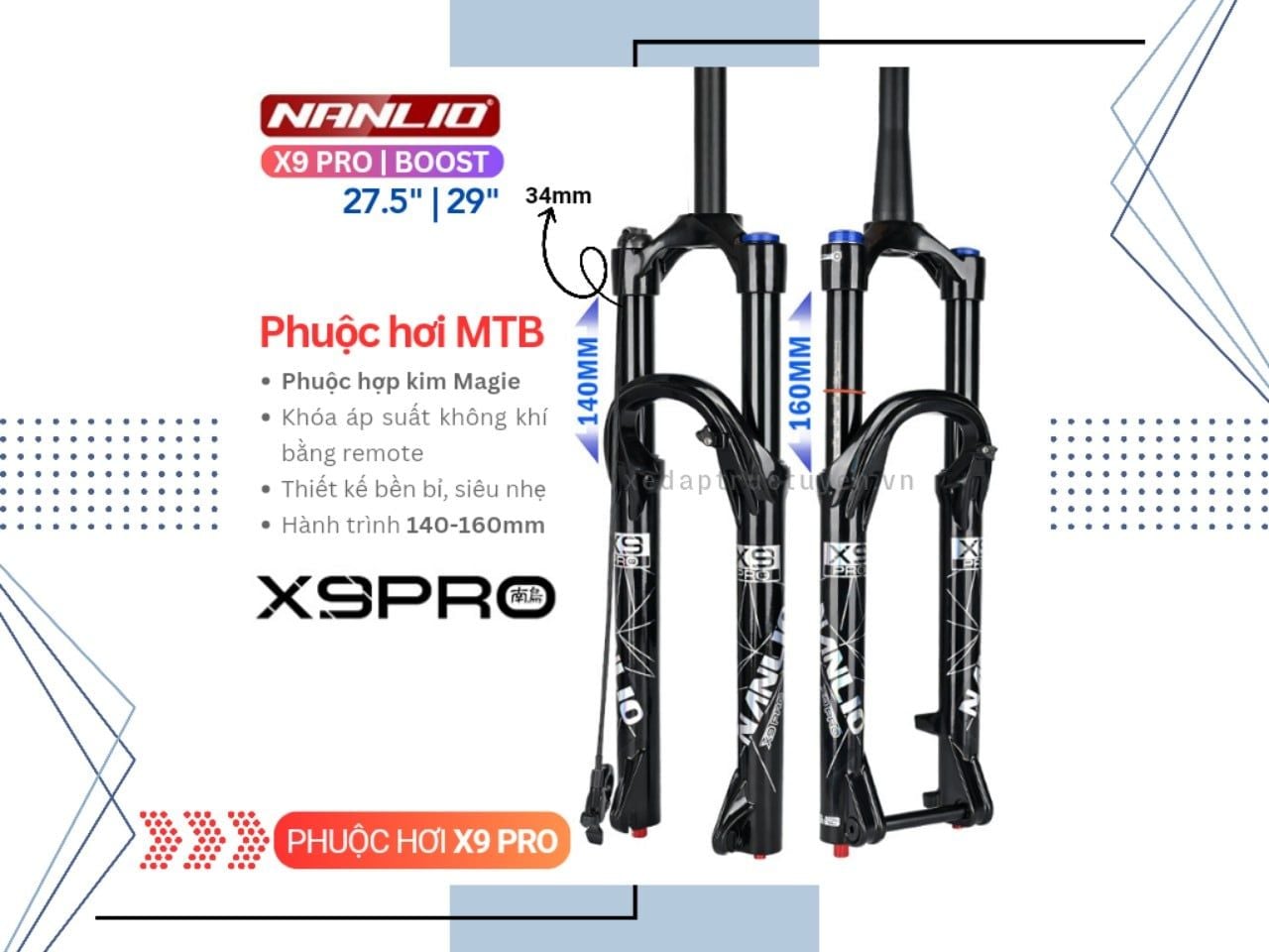 PHUỘC XE ĐẠP MTB 27.5" - NANLIO PRO X9 - HƠI - HÀNH TRÌNH 140mm - REMOTE - CỔ LỚN - ỐNG 34mm - THẮNG ĐĨA (CHỈNH REBOUND)